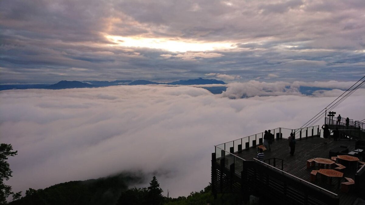 こちらはお盆初めの8月10日に撮影された雲海。SORA terraceでは、曇りや雨の後は綺麗な雲海が発生しやすいタイミングです。この日はお昼ごろはSORA terrace一面に霧と雲がかかっている状態でしたが、夕方には気温の変化とともに雲の標高が下がってきて美しい雲海になりました。