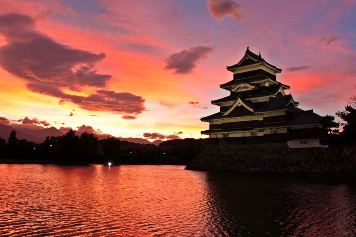 現存する五重六階の天守の中で日本最古の歴史を誇り、堂々たる佇まいで訪れる人を圧倒するのが国宝松本城です。漆黒の下見板と白い漆喰が織りなすコントラストは、背景にそびえる雄大な北アルプスの山々と見事な調和を見せ、四季折々で異なる美しさを描き出します。特に天候に恵まれた日には、お堀の水面に逆さ富士ならぬ逆さ城が映り込み、その幻想的な光景を写真に収めようと多くの観光客が足を止めます。