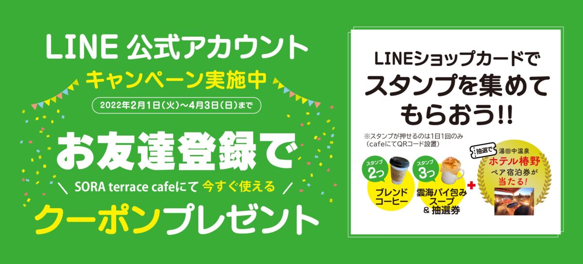 竜王スキーパークの公式LINEアカウントをお友達登録すれば、SORA terrace cafe でスグに使えるクーポンをプレゼント!!