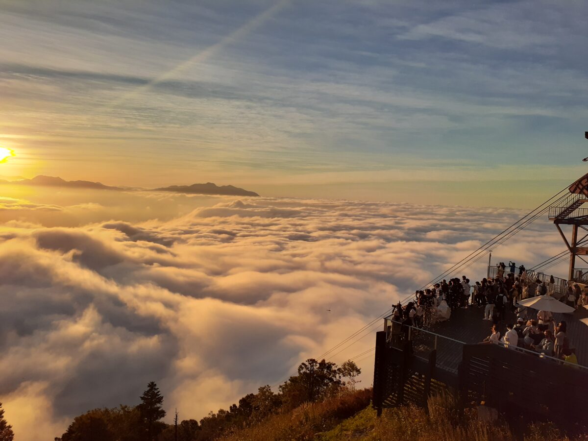 リース教室を開催するSORA terrace cafeは、ソファースペースやテーブル席、カウンター席など様々な種類の座席があり、室内でゆったりとくつろぎながら雲海の発生を待つことが出来る空間です。