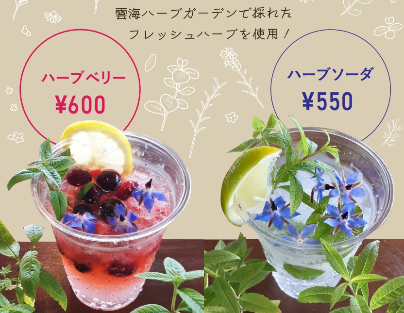 雲海ハーブガーデンで育てているハーブを使用したメニューもお楽しみいただけます。スッキリとした味わいでオススメなのは、ハーブを感じられるドリンク。少し甘さが欲しい方はハーブベリー(¥600)、爽やかなハーブの香りを楽しみたい方はハーブソーダ(¥500)をどうぞ!