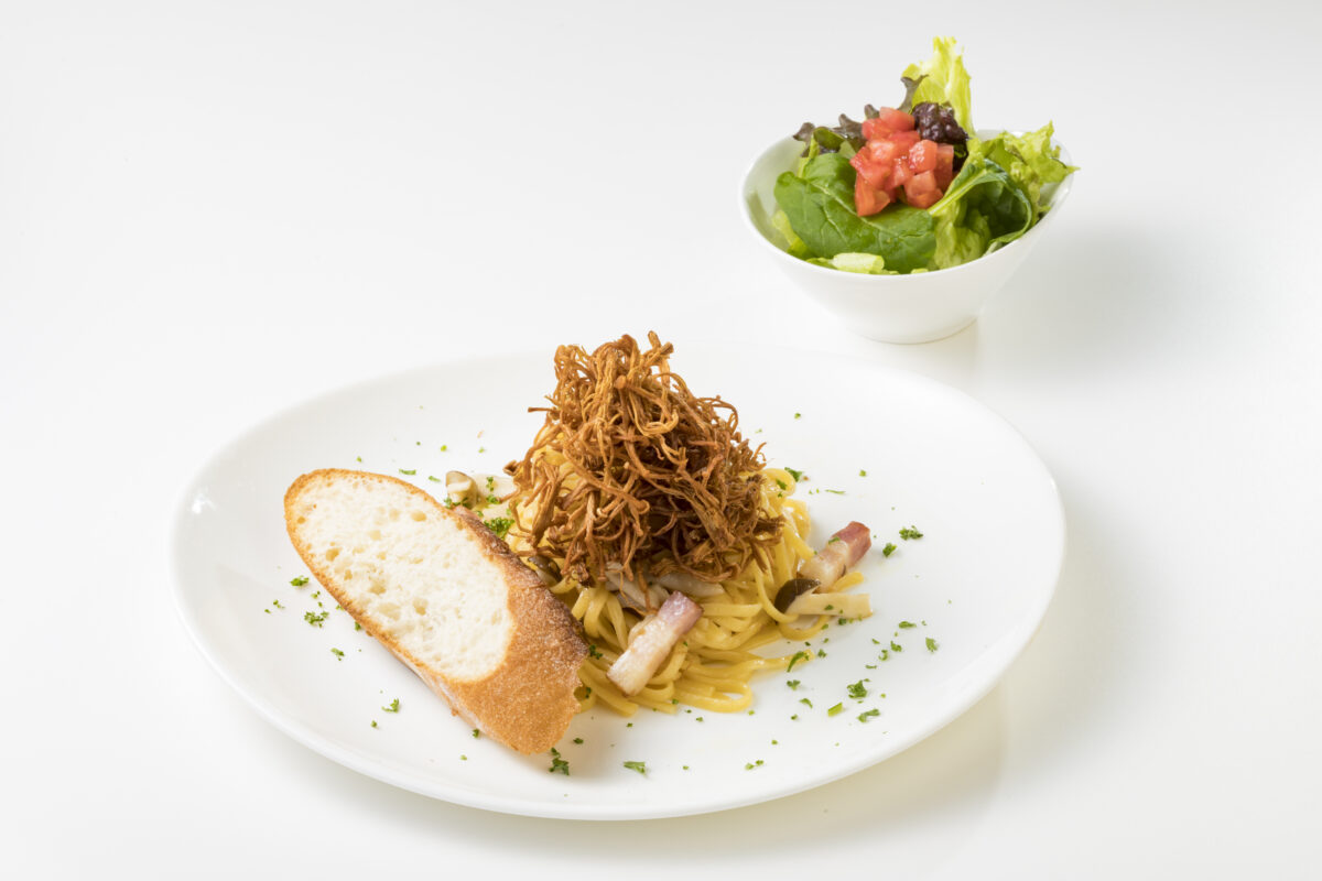 雲海に見立てたオリジナリティあふれるメニューや、地元のこだわり食材を用いたメニューもご用意。新メニューの「SORA KUMO」は、フワフワの雲に見立てたケーキで、中には地元産フルーツを使ったジャムが入っています。季節ごとに期間限定メニューもだしており、現在は信州産きのこを使用した「信州産きのこのペペロンチーノ・サラダ付き」を販売しております。
