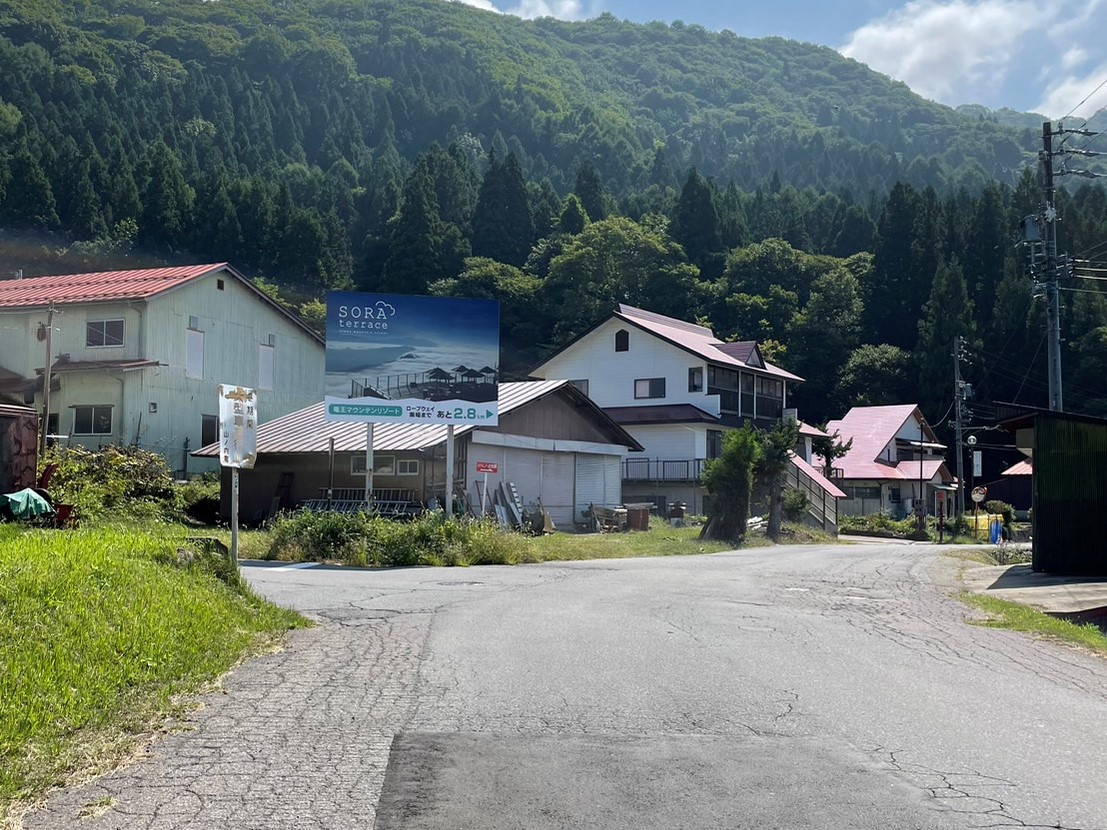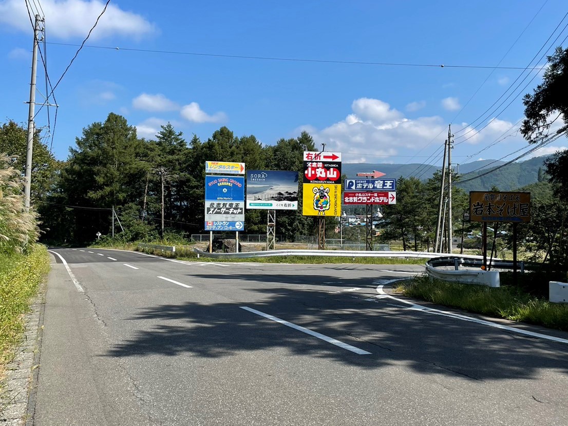 中野市から道中は分かりやすい道のりですが、途中から分かれ道など少し分かりづらくなりますので、迷いそうな場所の近くには大きな看板を設置しております♪