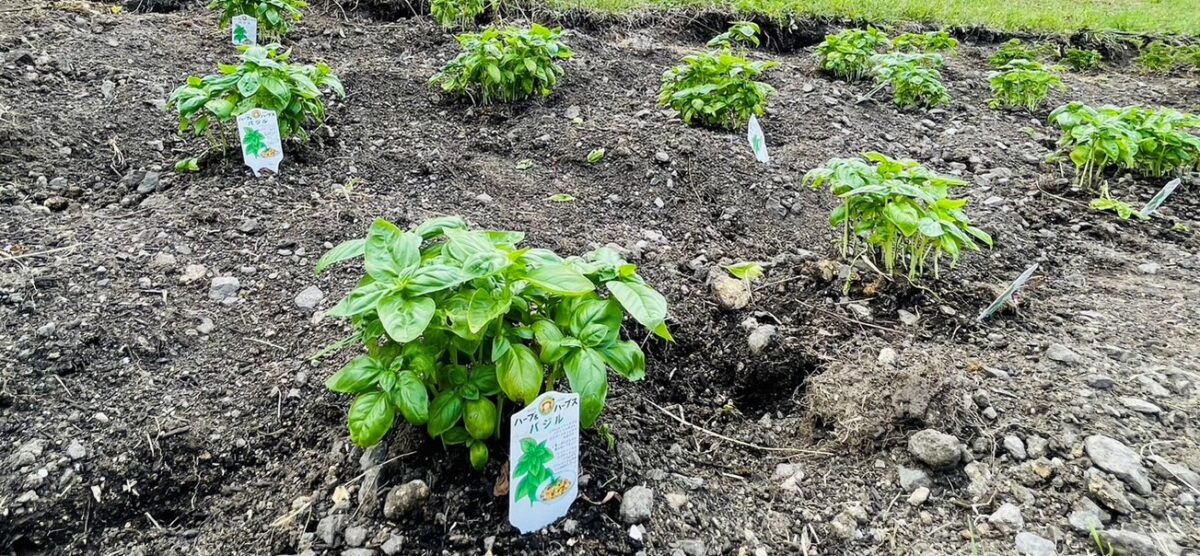 実はこのハーブ園で植えられているバジルなのですが、グランピング施設の朝食ピザのトッピングの1つとして使用しています!