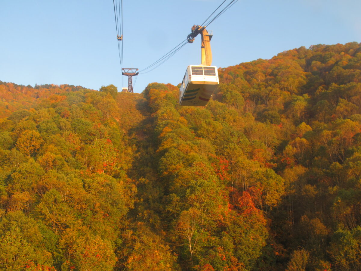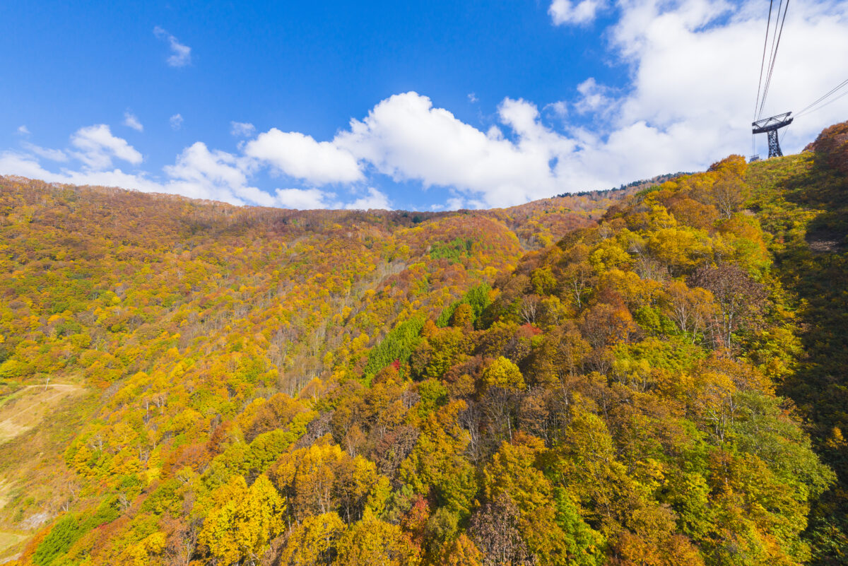 白樺・岳樺・ブナなどの木々が黄色く一面に広がり、モミジ・山葡萄・漆の木々が点々と赤く染まります。