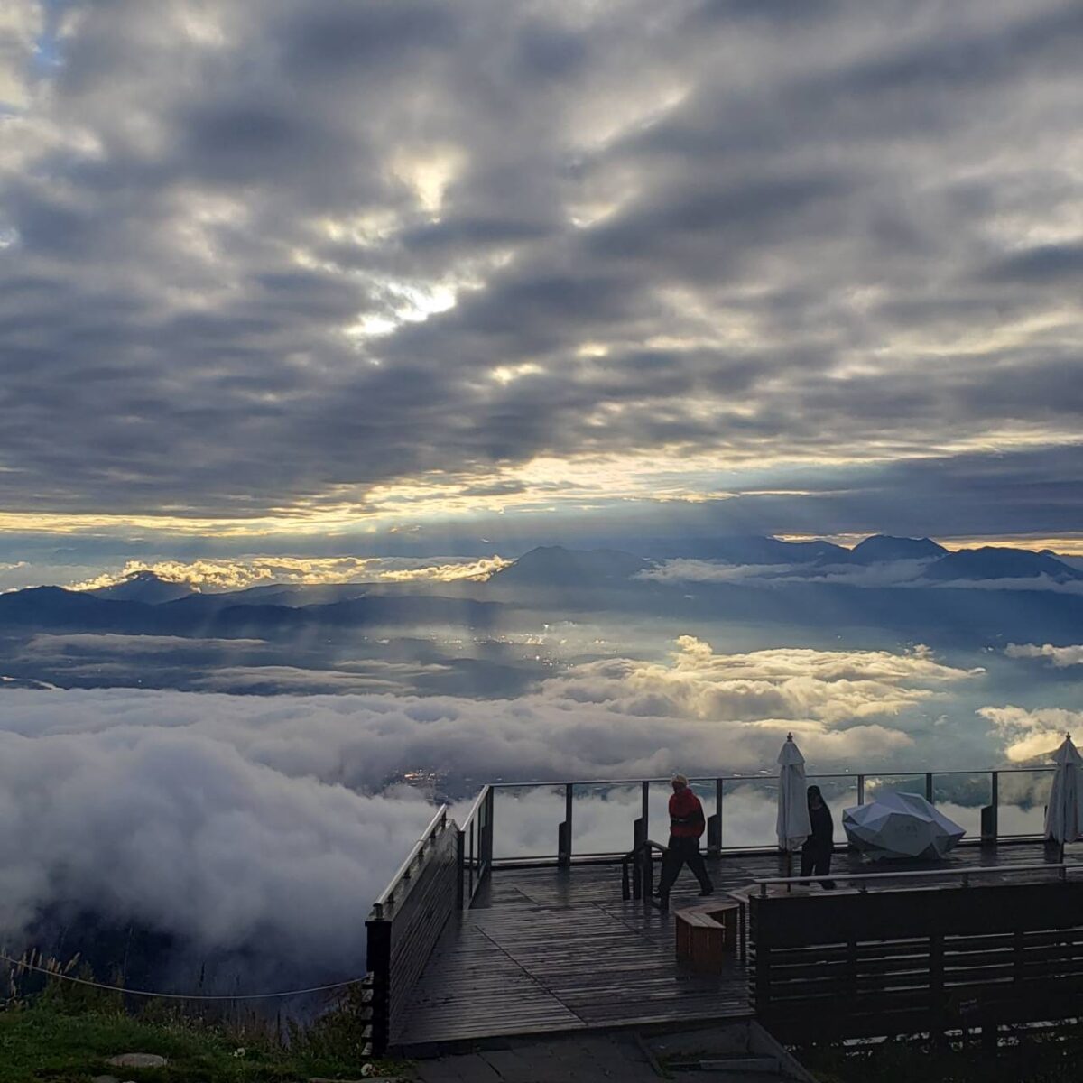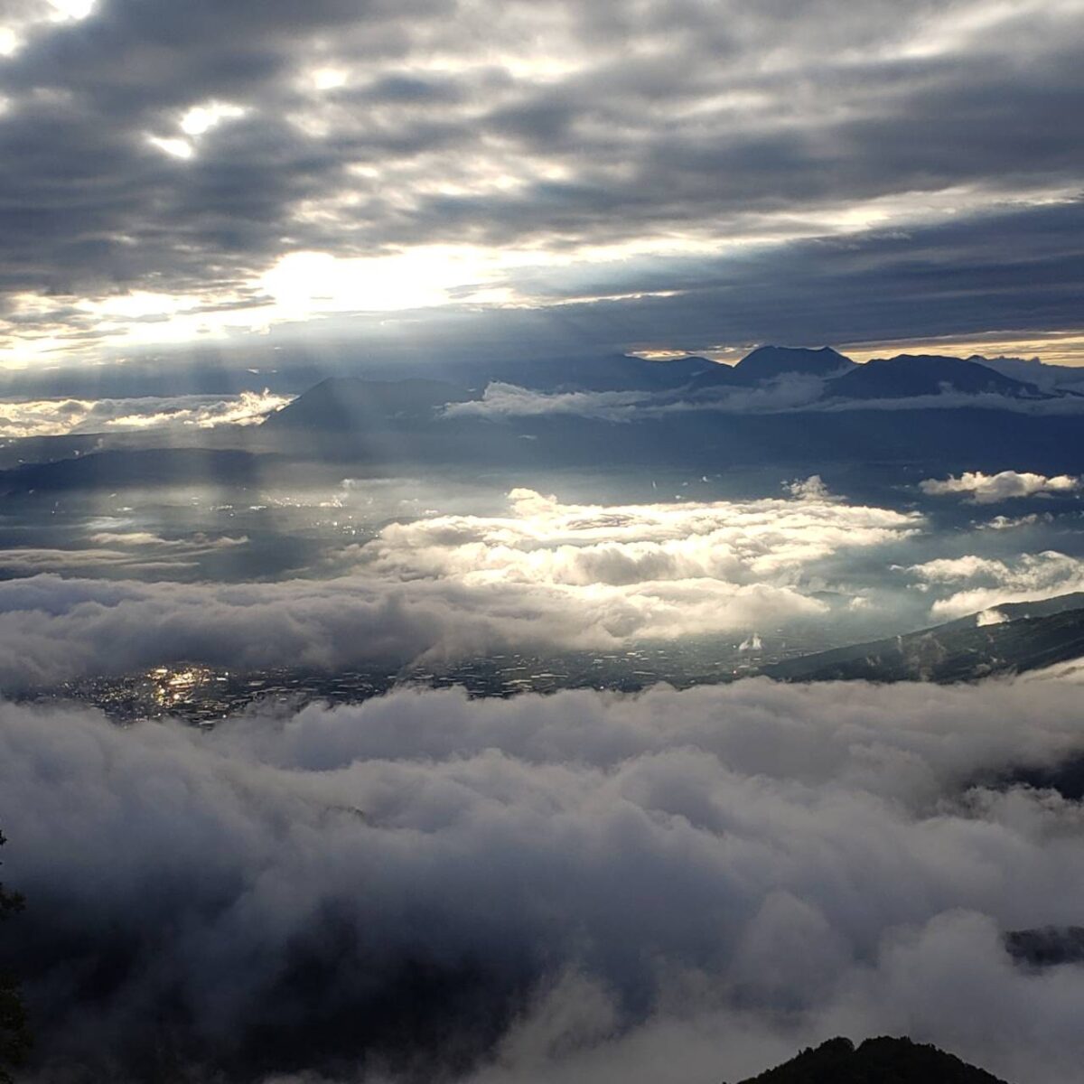 二重の雲海が発生したうえで雲の合間から日差しが落ちる現象「天使の梯子」を見ることができました。
