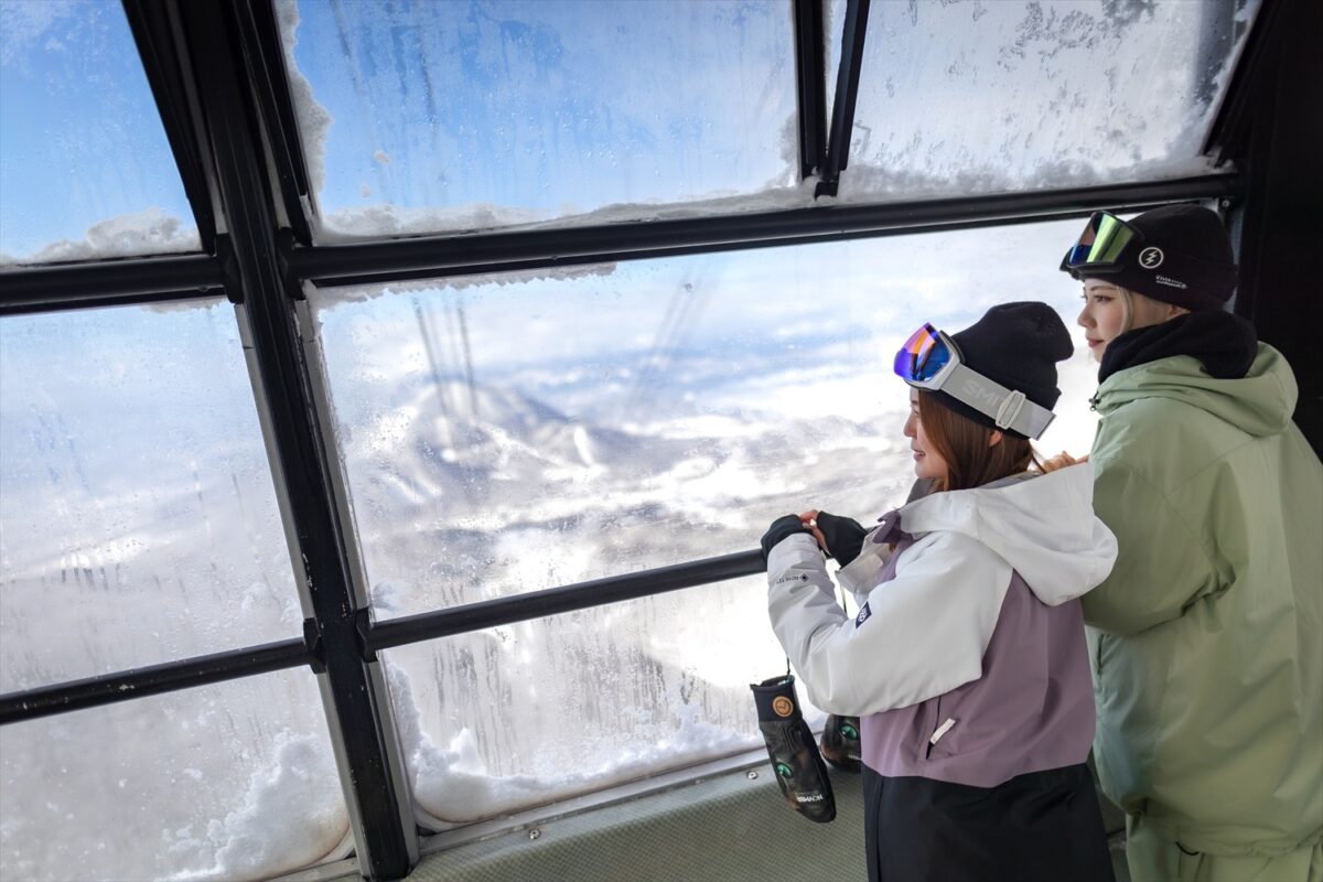 山頂エリアには、世界最大級166人乗りロープウェイに乗って向かいます。山並みを見ながら約10分間の空中散歩。眼下に広がる壮大な景色をお楽しみ頂けます。滑りながら見る景色とはまた一味違ってオススメ!
