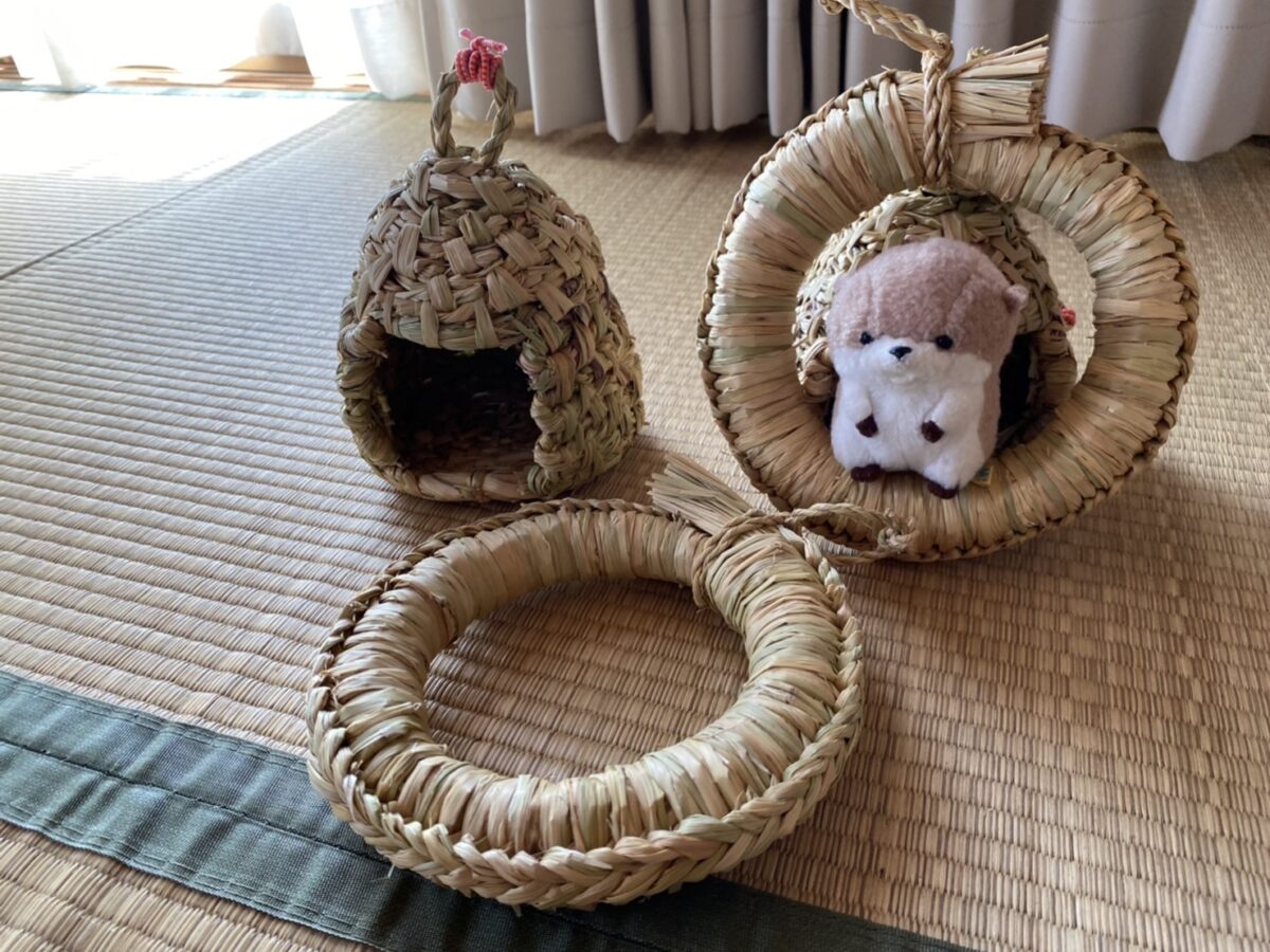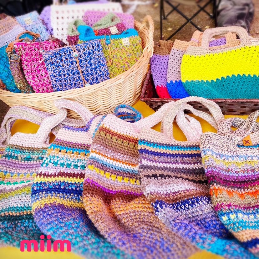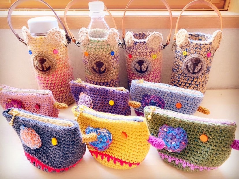 紹介文:春夏用の彩合わせの手編み帽子、麻紐の手編み雑貨、余り毛糸を使ったアップサイクルのバッグ、アクセサリーなど