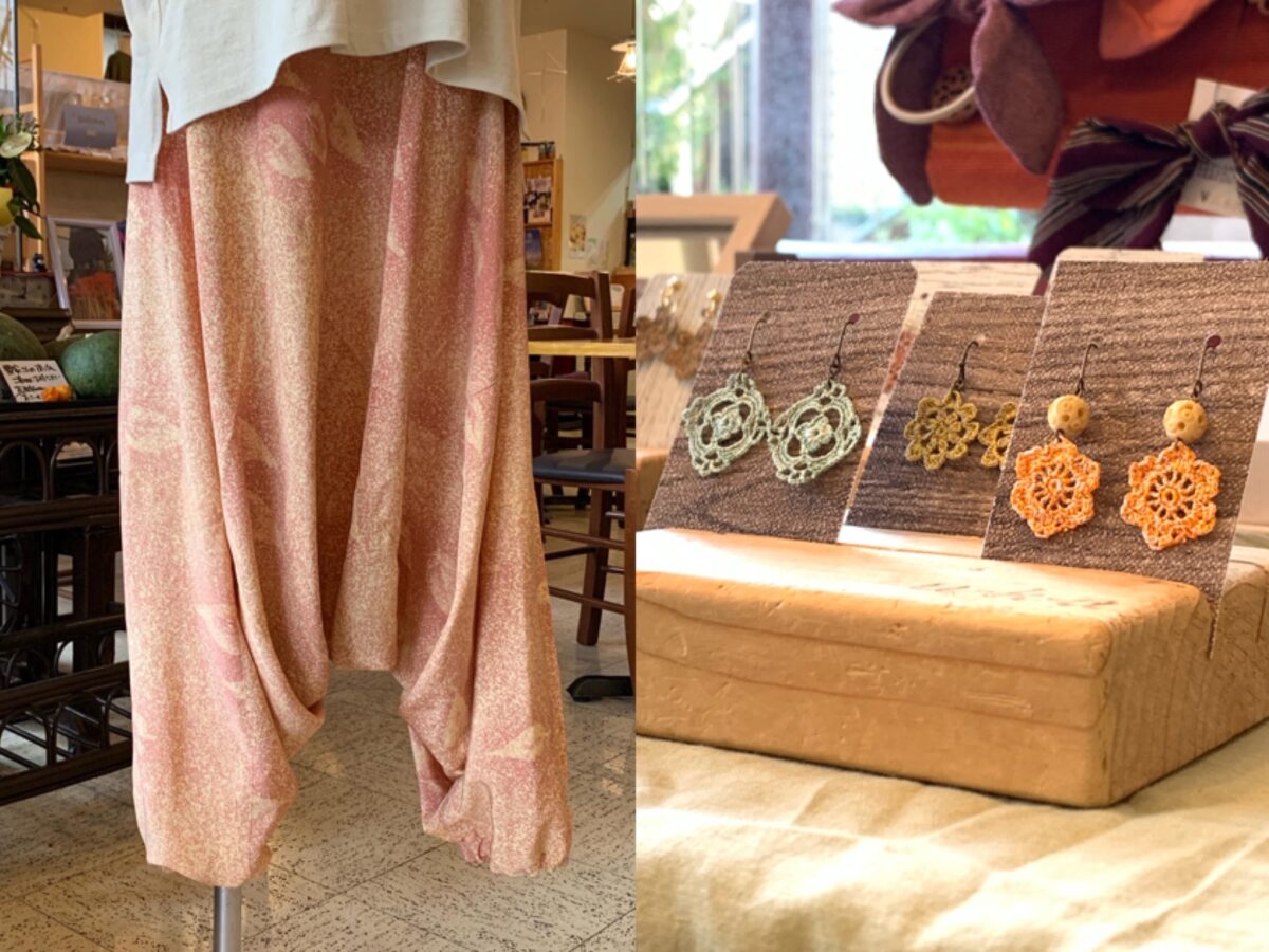 【販売商品】ミシン糸、シルクミシン糸の手編みレースアクセサリー、着物リメイクサルエル風パンツ、バッグ、小物