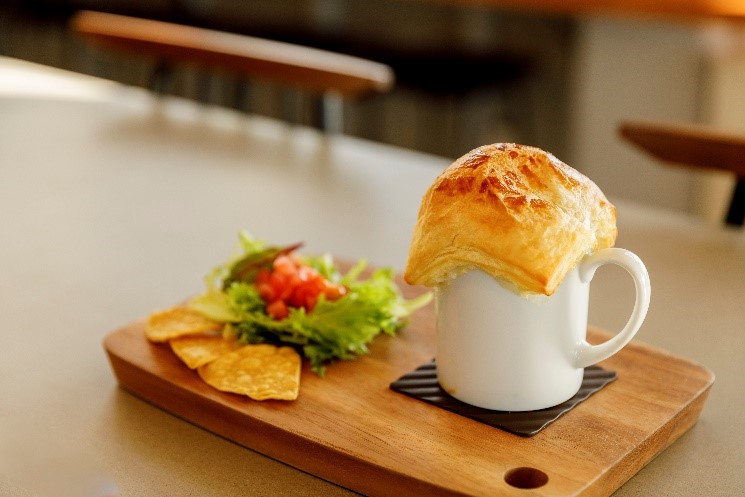 雲海に見立てたクリーミーなスープをサクサクのパイで包みました。冷えた体を温めるにはピッタリなスープです。