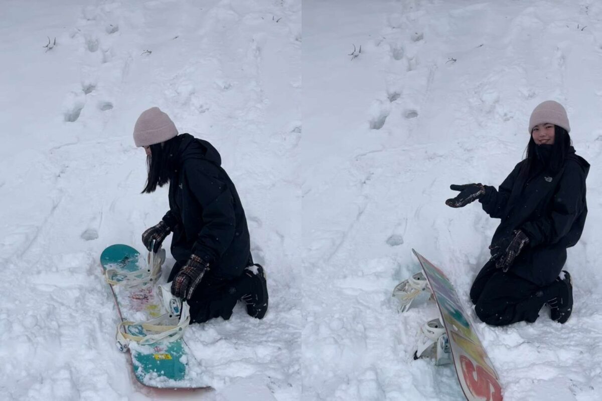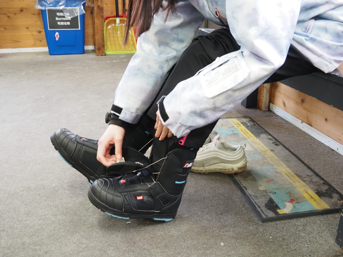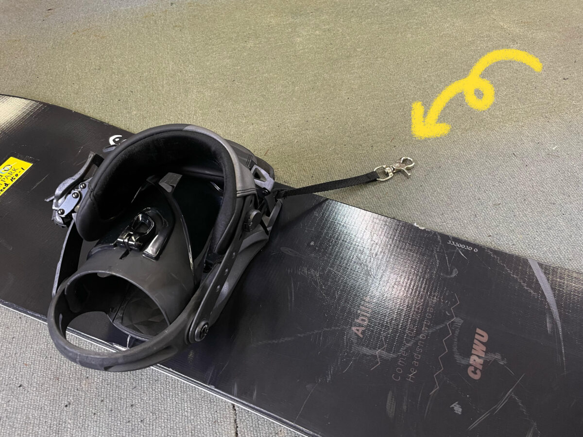 板を外さなければならない時は、バインディング(ブーツを固定する器具)を下に。ぐっと雪面に押して、板を動かないようにしておきます。