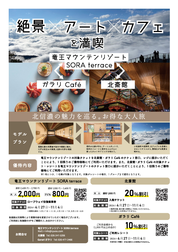 北斎館敷地内のアートギャラリーとカフェを融合した2階建て店舗。1階にはテイクアウトを中心とした「ガラリ Café」、2階には地元作家の作品を展示・販売するアートギャラリー「ガラリ Showcase」が入っております。ガラリ Caféでは、手に取りやすいよう、タルトを手のひらサイズにした「タルトレット」が看板メニュー。信州産フルーツを使用したメニューやドリンク、季節に合わせたメニュー楽しめます。