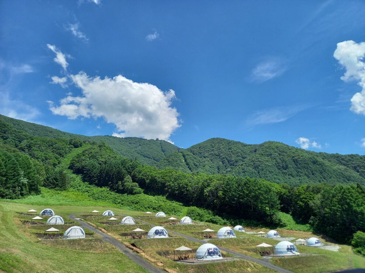 ドームテントが建っているのは、冬には積雪が2mを超えるゲレンデの斜面!特別に斜面を段々畑状に切り開き造成。他では無いここでしか体験出来ない最高のロケーションです。