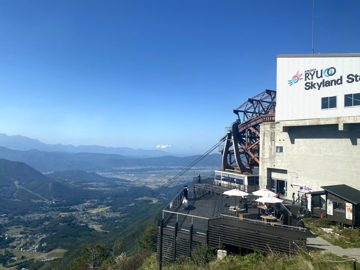 標高1,770m、空気の澄み切った山頂にある「SORA terrace (ソラテラス)」は急斜面に建てられており、その2段式テラスからは、長野市、中野市、飯山市、木島平村を見下ろす大パノラマが目の前に広がります。