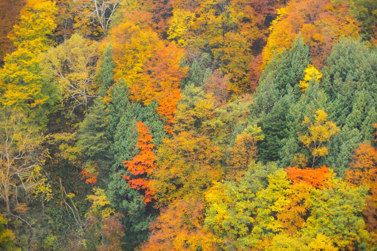 白樺・岳樺・ブナなどの木々が黄色く一面に広がり、モミジ・山葡萄・漆の木々が点々と赤く染まります。