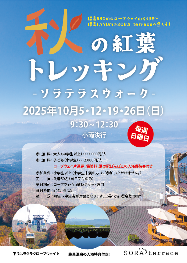 標高980mのロープウェイ山麓駅~標高1,770mの「SORA terrace」まで、紅葉を楽しみながらトレッキングをお楽しみいただけるイベントです♪