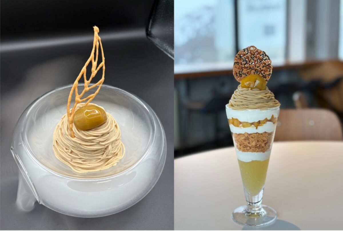 (左)信州産小布施栗の雲海モンブラン(右)信州産小布施栗と信州産リンゴのパフェ