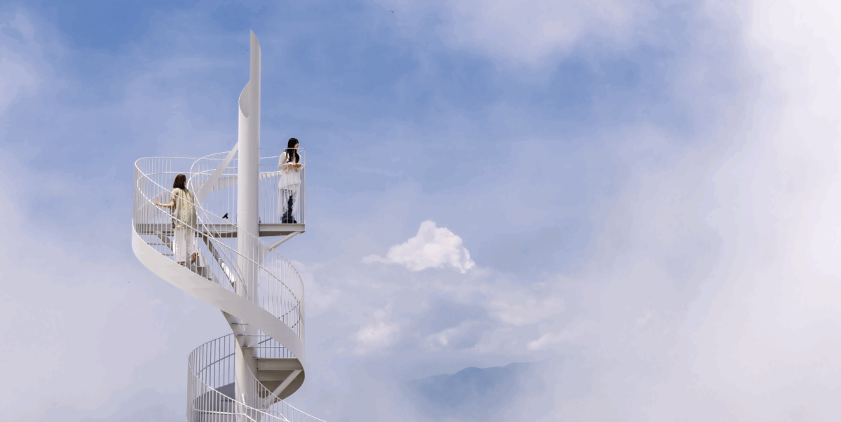 みんなで螺旋階段に並ぶ写真や雲を抜けた景色を背景に集合写真など、竜王マウンテンリゾート SORA terraceに来た旅の思い出にオススメです。