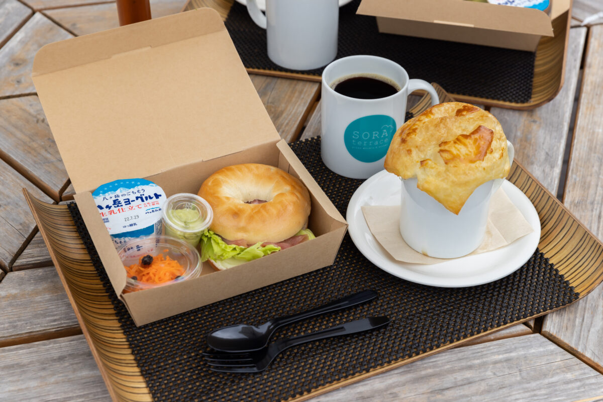 限定メニューは「雲海パイ包みスープ」と「モーニングボックス」がセットになり、「モーニングボックス」には生ハムのベーグルサンドや雪下人参のラペ、八ヶ岳ヨーグルトなどの地元産の食材を使用しております♪さらに、SORA terrace モーニング利用者限定で、オリジナルブレンド珈琲と紅茶もお楽しみいただけます!