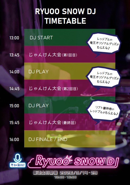 13:45~,14:45~,15:45~に「来シーズンのリフト1日優待券」や「スキー場オリジナルグッズ」がもらえる「じゃんけん大会」を開催します!