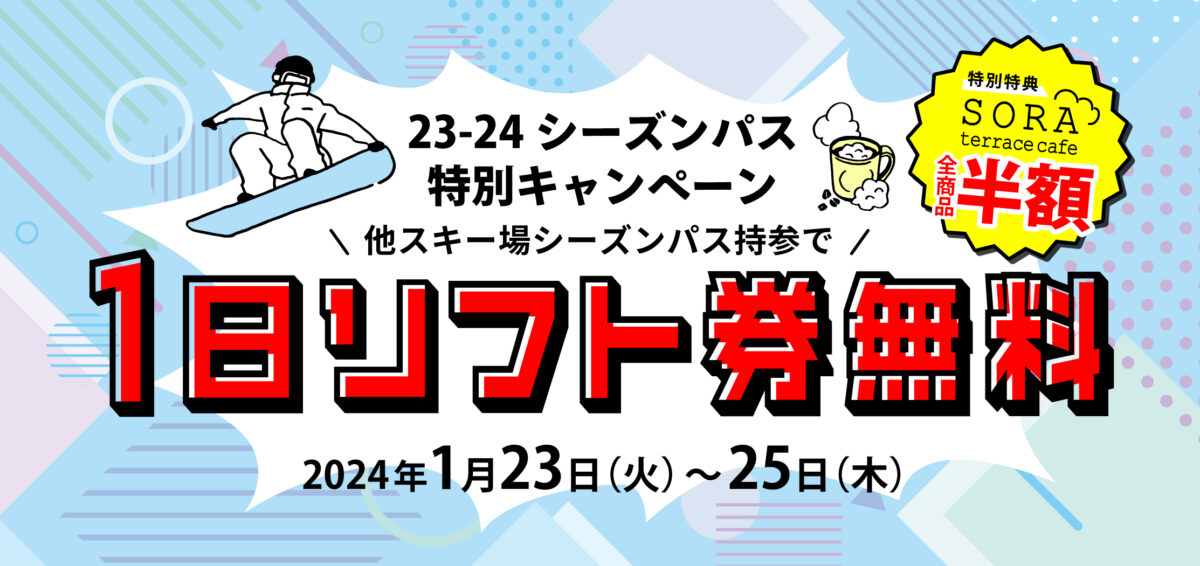 竜王以外のシーズン券をお持ちの方(ご本人様のみ)ご提示いただけると、竜王スキーパークのリフト券が無料になります!このキャンペーンで竜王スキーパークを存分に楽しんでください!