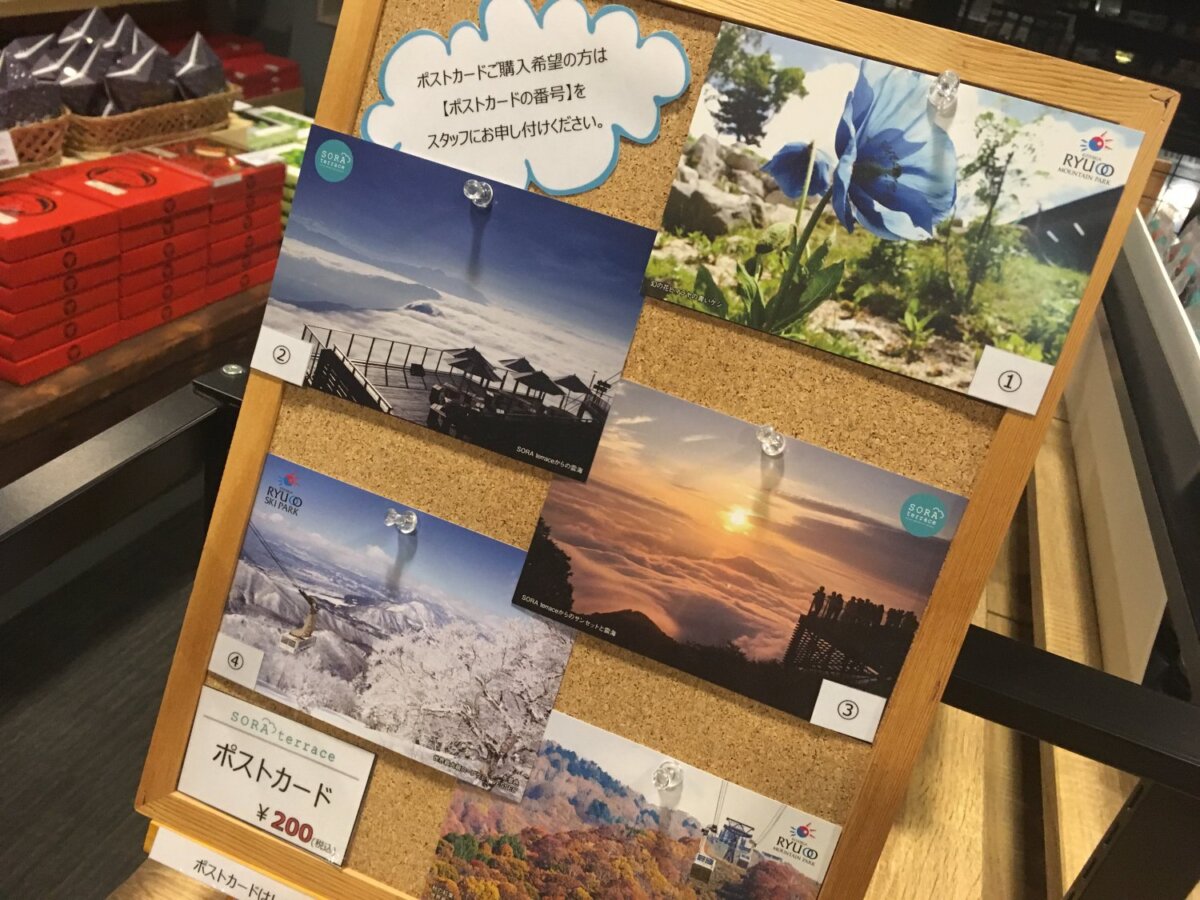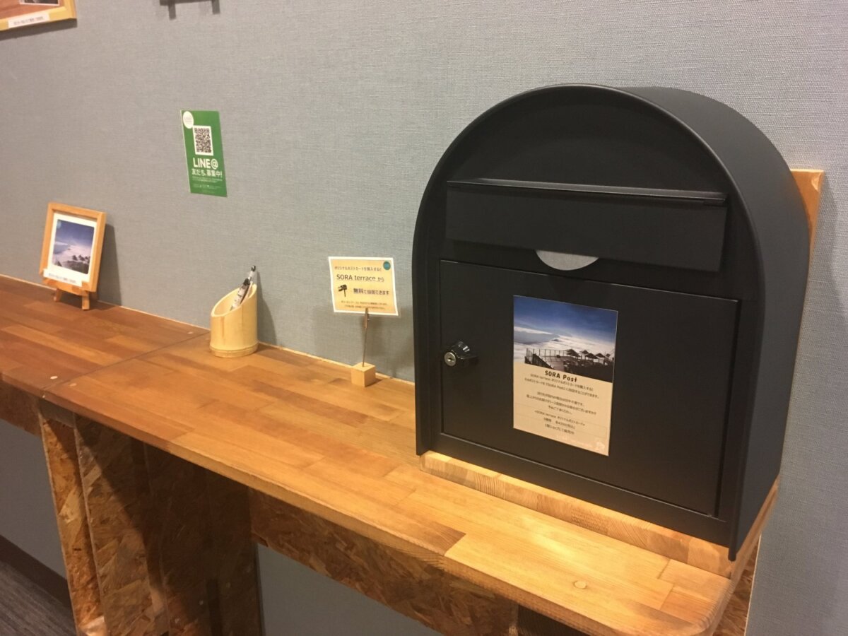 SORA PostはSORA terraceお土産ショップ入り口の右手にございます。SORA terraceで絶景と出会えたときの感動をポストカードに書き残して、ご家族やご友人にあなたの感動を届けてみてはいかがでしょうか。投函いただいたポストカードは一枚一枚心を込めて、雲の上からお届けします。