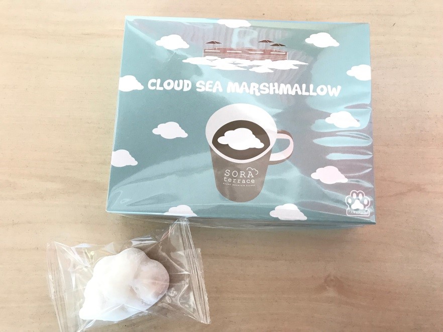 SORA terraceの雲海を模したマシュマロ。ご自宅でも温かいお飲み物の上に浮かべてお楽しみいただけます。熱でマシュマロが溶けていく様子は、まるで空に雲海が広がっていくよう。珈琲だけでなく、ホットココアとの相性も抜群です。