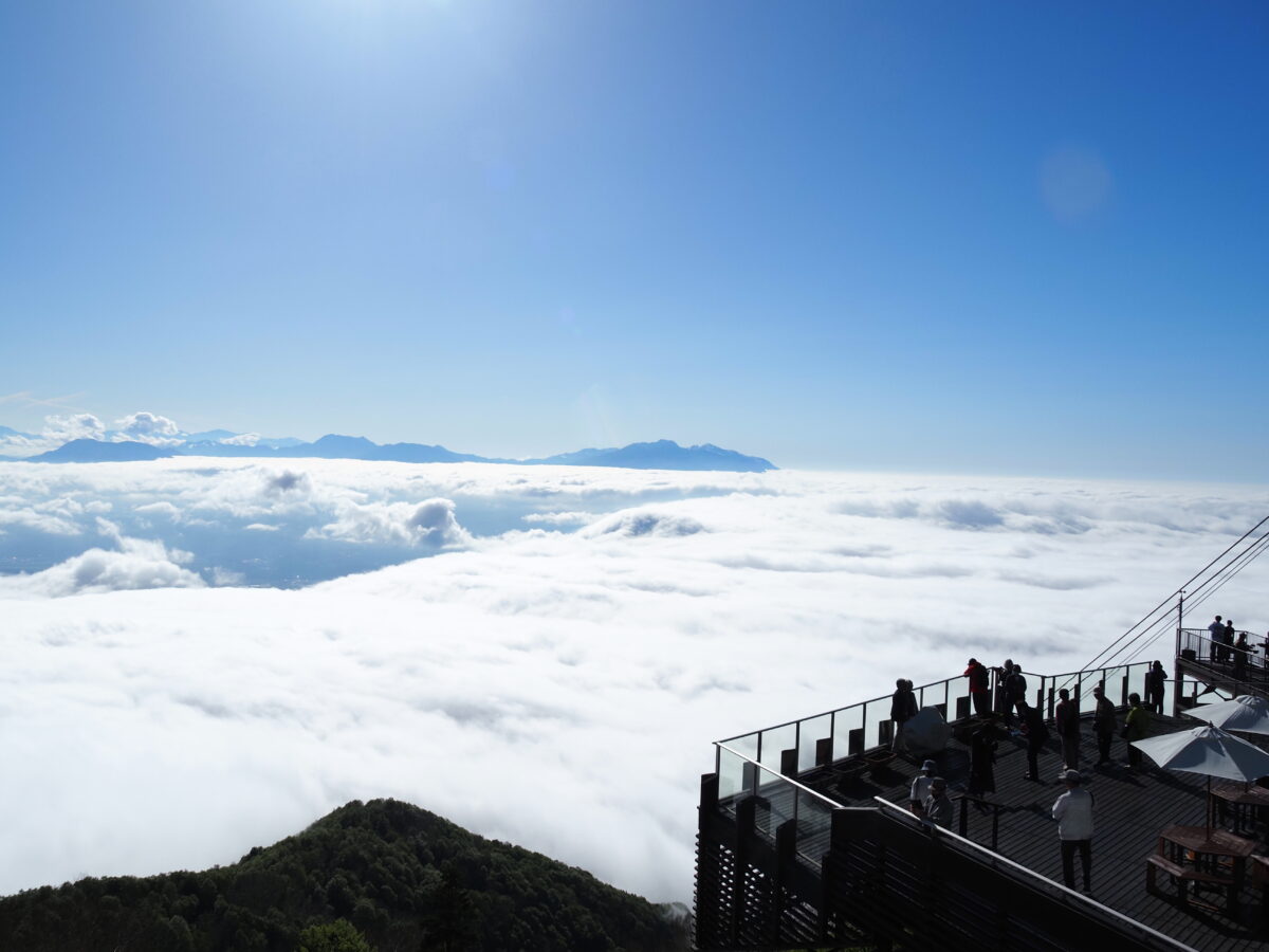 標高1,770m、空気の澄み切った山頂にある「SORA terrace (ソラテラス)」は急斜面に建てられており、気象条件がうまくいけば、訪れた人にしか味わえない幻想的な雲海を体験することもできます。