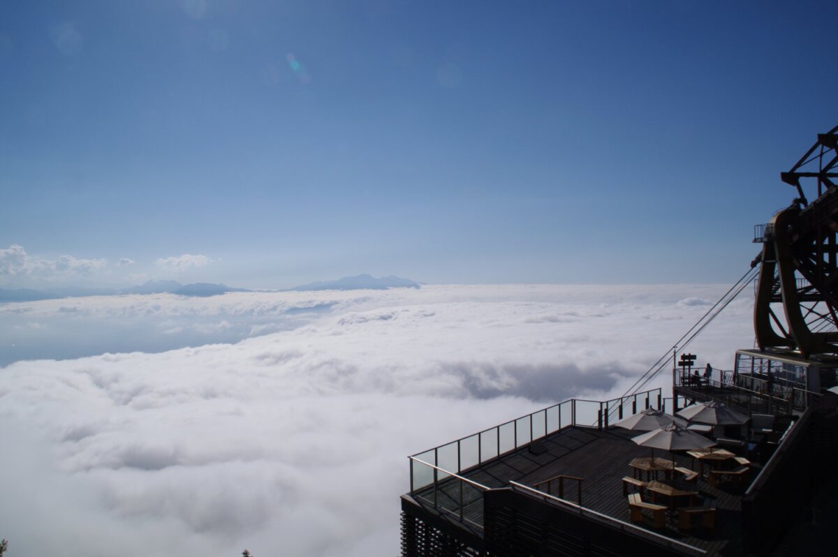 あっという間に山頂へ。山頂駅を出るとすぐ、SORA terraceにたどり着きます。雲海をバックに写真を撮って、旅の記念の一枚に。