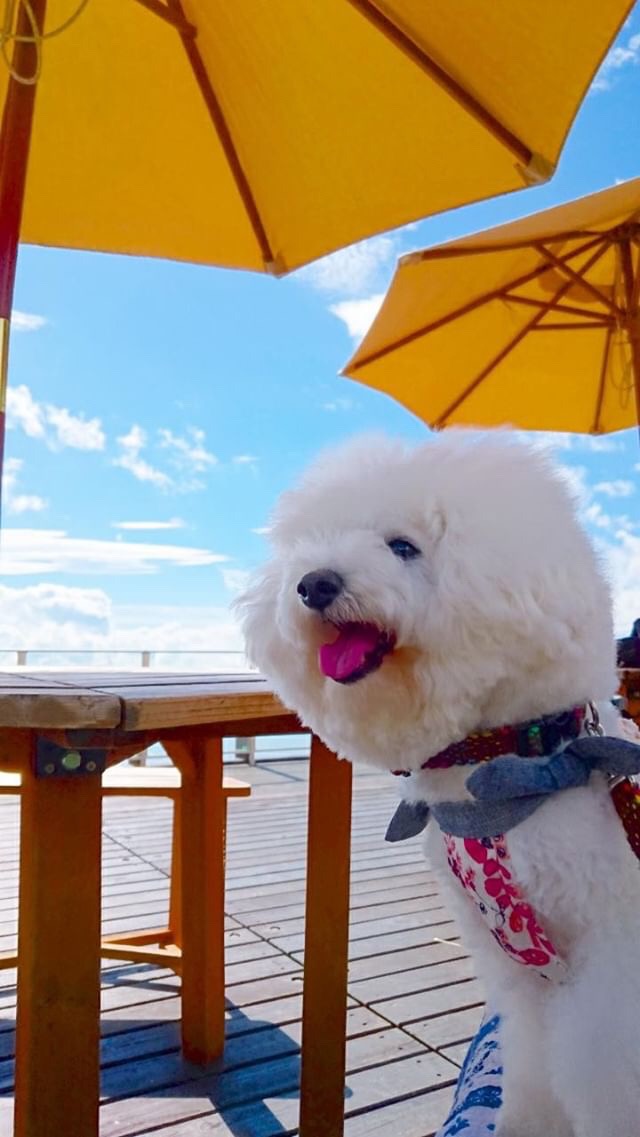 風が涼しいので、暑いのが苦手なワンちゃんもSORA terraceにあるパラソルの日陰に入れば、とても心地よく過ごせます。青空の下で風を感じて、ワンちゃんも気持ちよさそうです。