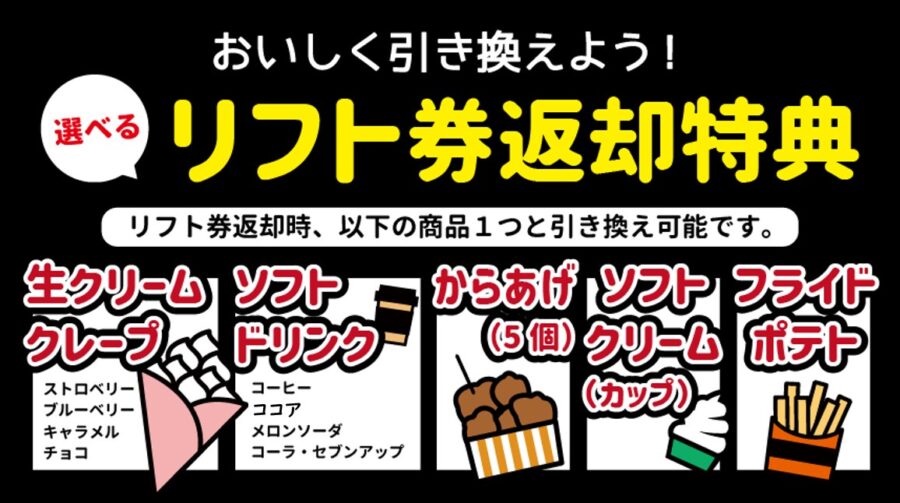 EVENTNEWS リフト券返却特典開始! 2022.12.17 インフォメーションセンター2Fのクレープショップにて、リフト券返却特典実施中! リフト券購入時にお預かりした保証金500円を現金でお返しする代わりに・・・クレープショップにて販売している美味しい商品と引き換えられてとってもお得♪ ご希望の方は、インフォメーションセンター2階のクレープショップカウンターで引換え希望商品を伝え、返却するリフト券をお渡しください。