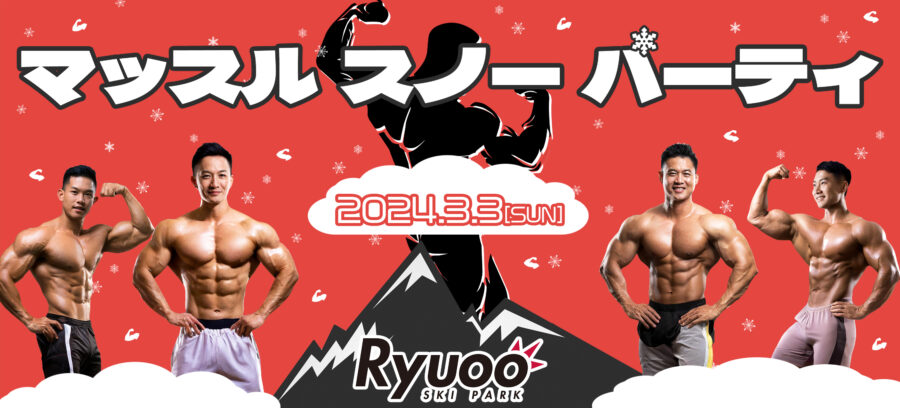 NEWS 前代未聞!? マッスルスノーパーティー開催!! 2024.02.13 3月3日 竜王スキーパークでマッスルスノーパーティを開催します! 当日は竜王スキーパーク内にてゲレンデ内やレストラン内(山頂カフェ& THE BASE)にマッスルが多数出現!! マッスルなお兄さんと一緒にスノボを楽しもう! 詳細はコチラよりご確認ください!